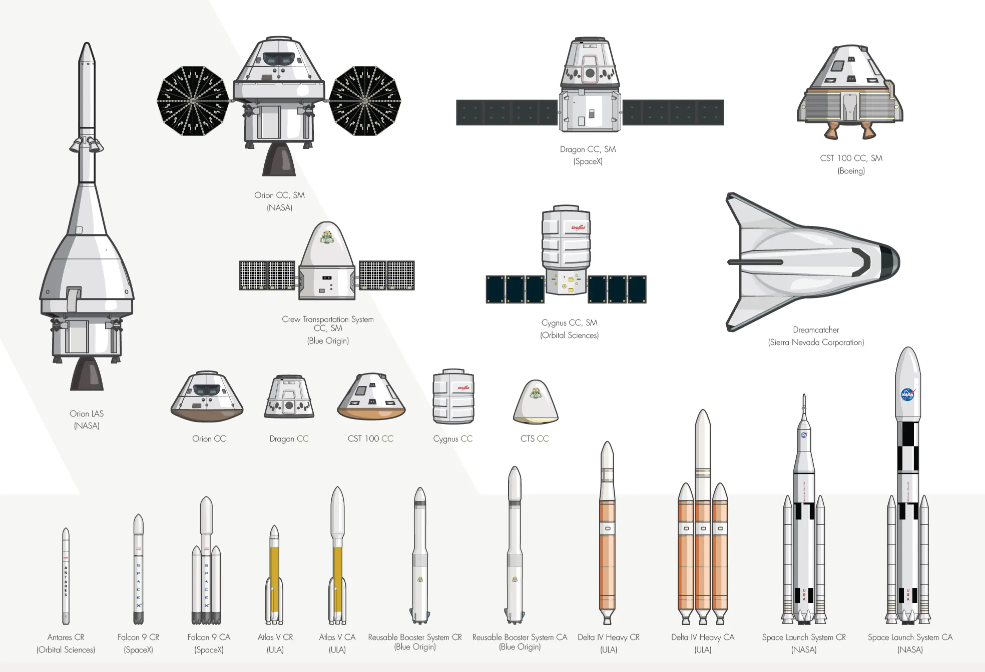 SM = service module, CC = crew capsule, CA = cargo configuration, CR = crew configuration, LAS = launch abort system
